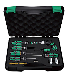 1把可调式扭矩螺丝刀4.0-8.8Nm,枪形手柄;1把预制式扭矩螺丝刀3.3Nm;1把预制式扭矩螺丝刀1.4Nm TX 10;1把预制式扭矩螺丝刀1.25Nm TX 10;1个valve dolly;1个批头867/4 HF TX 15x50mm,可固持TORX®梅花螺丝;1个批头867/4 HF TX 20x50mm,可固持TORX®梅花螺丝;1个套筒790 A/50 SW 12.0x50mm;1个转接头870/1,¼"六角转接¼"四角;1个阀门插入工具,预设扭矩0.25Nm;1个阀门插入工具,预设扭矩0.45Nm