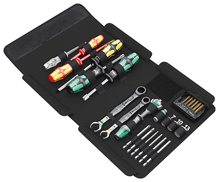 2把Joker棘轮两用扳手带特殊设计,可防止打滑和掉落螺丝,可传递更多力量;1把1/4" 8000 A Zyklop棘轮扳手,操作快速而高效;3个8790 HMA Zyklop套筒,用于手动和电动工具应用;1个8784 A1 Zyklop转接头;6个867/4 TORX® HF梅花批头,带固持功能,可牢固夹持螺丝,避免螺丝丢失;1只247测电笔;2把100系列Kraftform VDE绝缘一字螺丝刀160 i和160 iS,用于确保在1,000V电压下的安全作业(160 iS为小直径刀杆,带整体绝缘防护,以便进入并安装沉头螺丝以及弹簧原件);1把932 A Kraftform一字敲击螺丝刀,六角形一体式设计,带冲击帽,可用于拆装螺丝和简单的敲击工作;2把395 HO螺母螺丝刀,带空心刀杆,能紧固和松开长螺杆上的螺丝,也能处理被卡死的螺丝